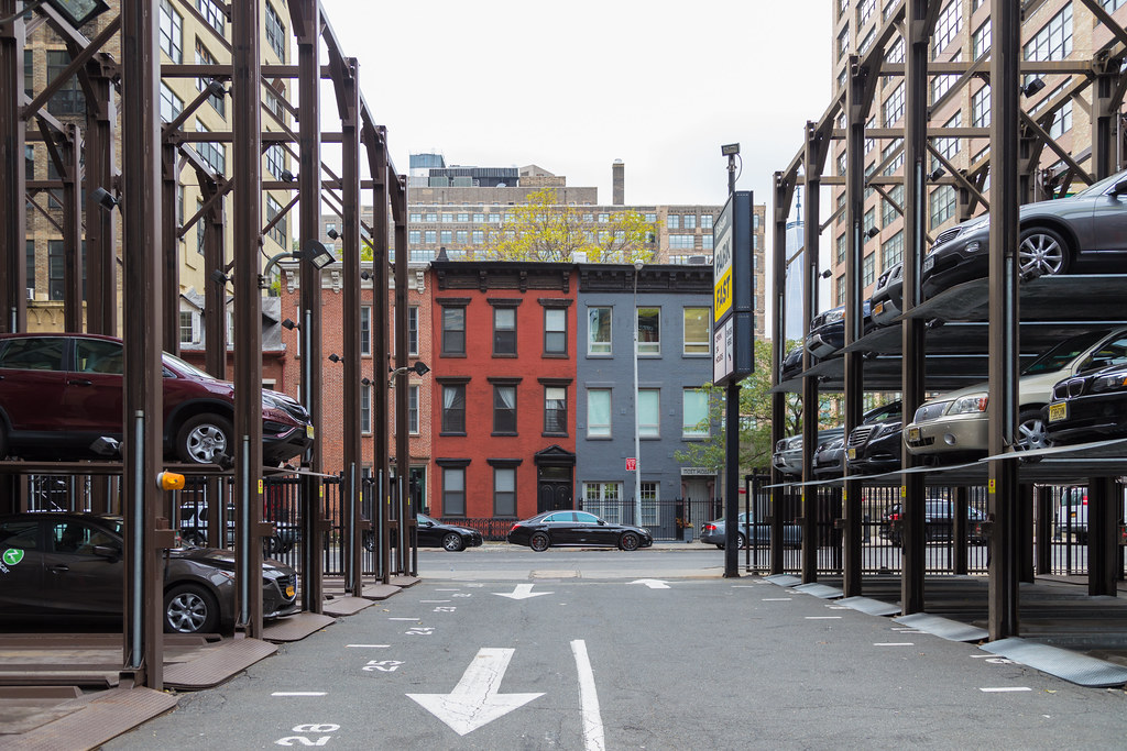 Багаторівнева парковка та залишки старої архітектури (більшість подібних будинків вже знесено, а на їхньому місці збудовані офісні та житлові будинки)