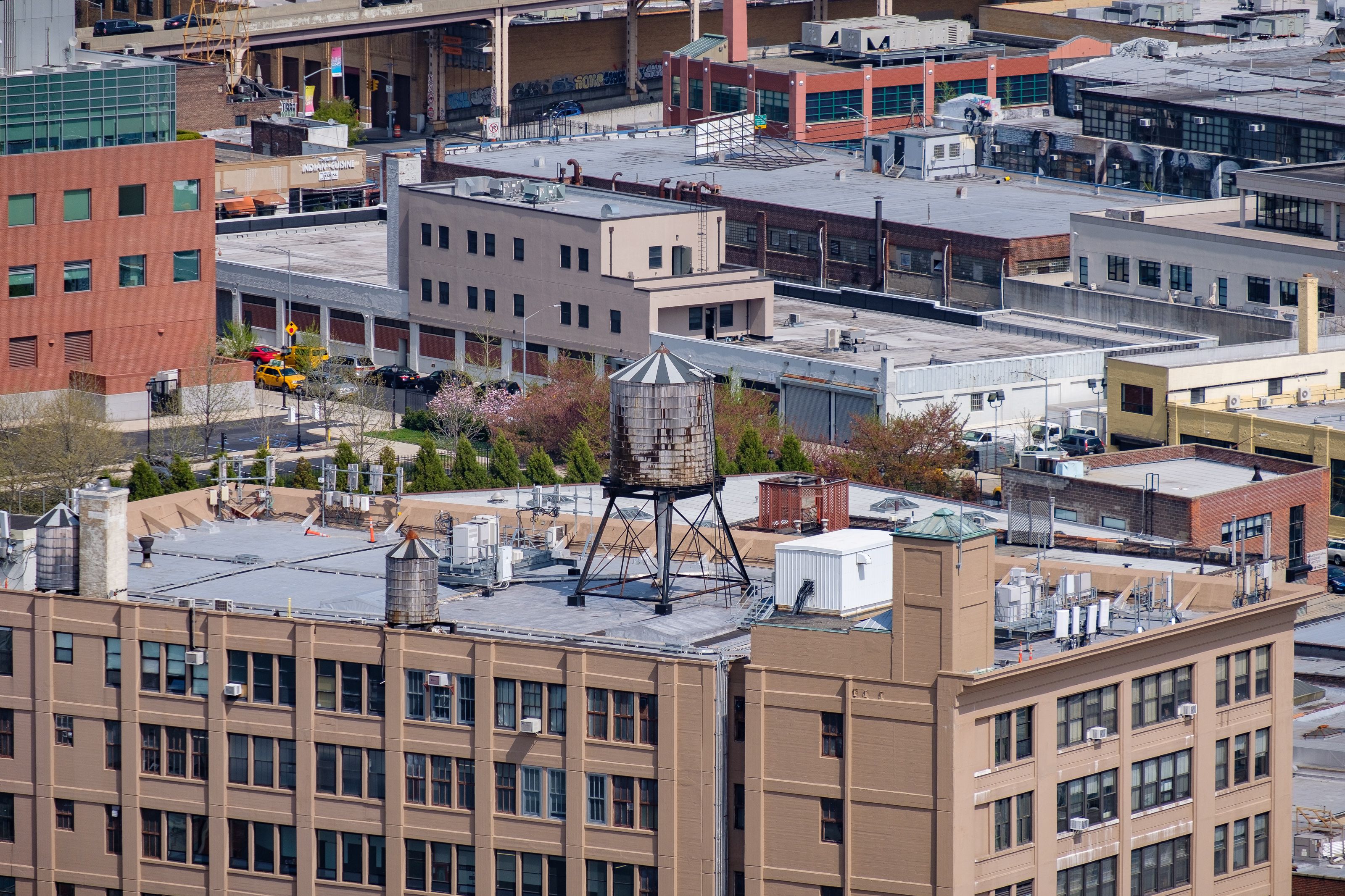 На даху цієї будівлі всі водні баки пофарбовані у чорно-білу смужку
