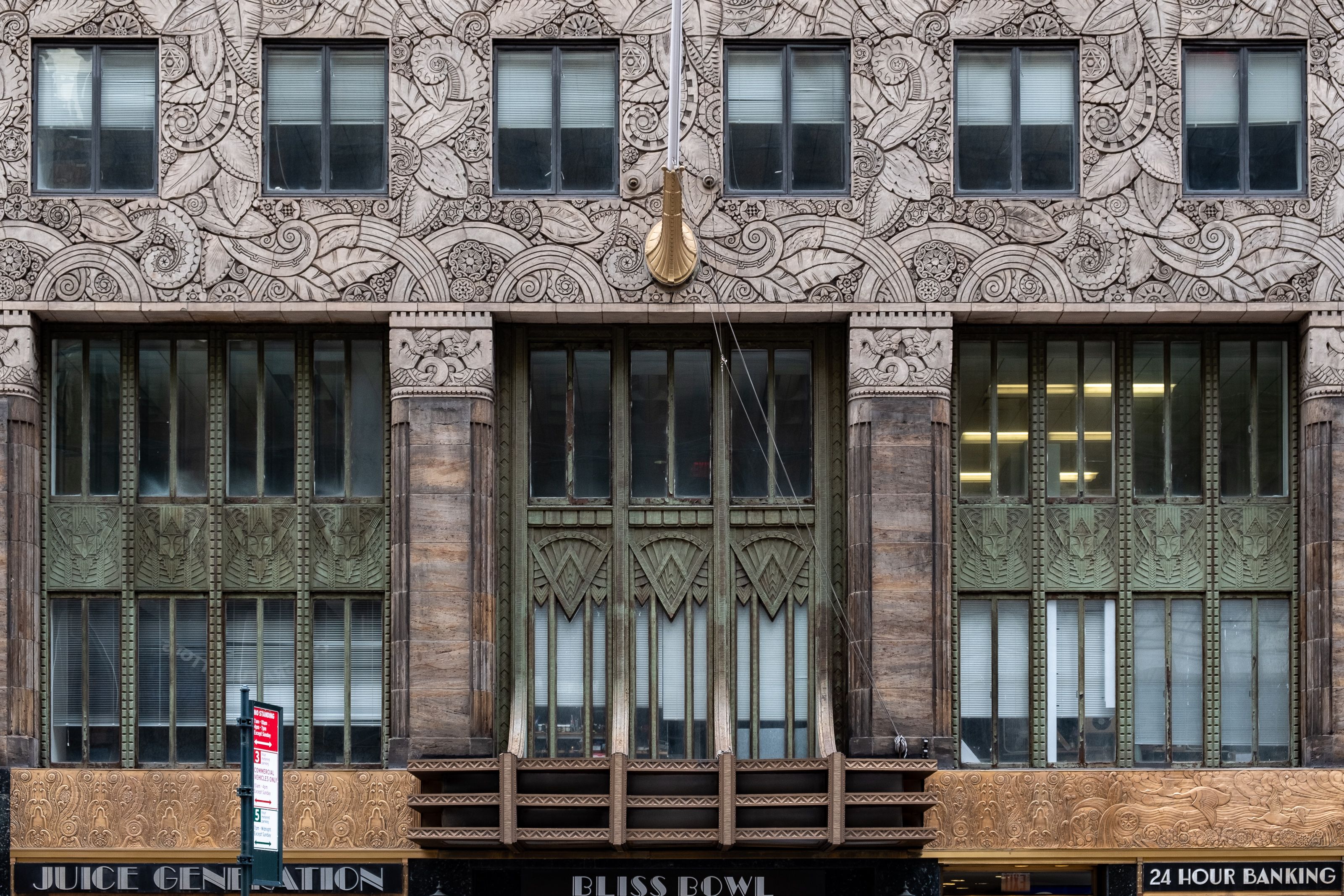 Chanin Building — будинок у стилі ар-деко з теракотовим фасадом. Навіть шрифт вивісок гармонійно вписується у загальний стиль