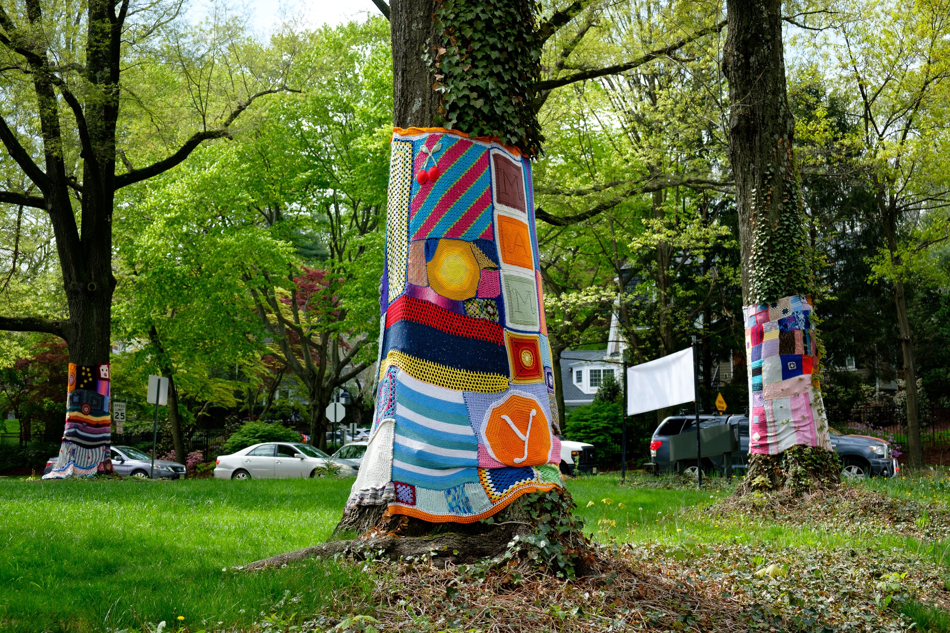 Дерева, одягнені у в’язане вбрання — це інсталяція місцевого арт-музею (Montclair Art Museum)